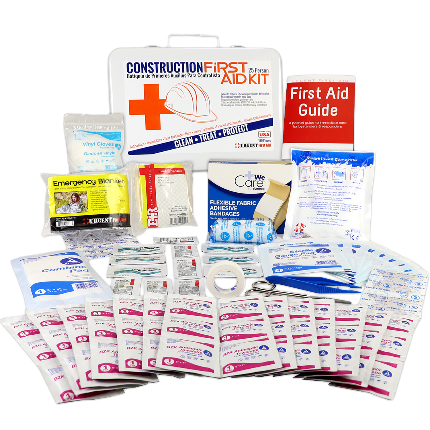 OSHA’s 1926.50(d)(1) requires that employers make certain “first aid supplies shall be easily accessible when required.” and, 1926.50(d)(2) requires that “the contents of the first aid kit shall be placed in a weatherproof container.” This is why Urgent First Aid™ assembles these construction site first aid kits (right here in the USA) in sturdy gasketed powder-coated steel first aid boxes that help keep the dust and moisture out of your first aid supplies. This 180 piece construction first aid kit exceeds federal OSHA requirements and is perfect for work-vehicles and to have while on the job-site. The Kit includes everything you need from bandages, compresses, triangular/sling bandage, gauze pads, antiseptic towelettes, first aid tape, exam gloves, burn relief, even an instant cold compress to treat those contusions from on-the-job bumps and more – plus the kit designers went further, too, by upping the quality standard and including only 12-ply gauze pads instead of the less expensive (and less effective) 8-ply or 4-ply.