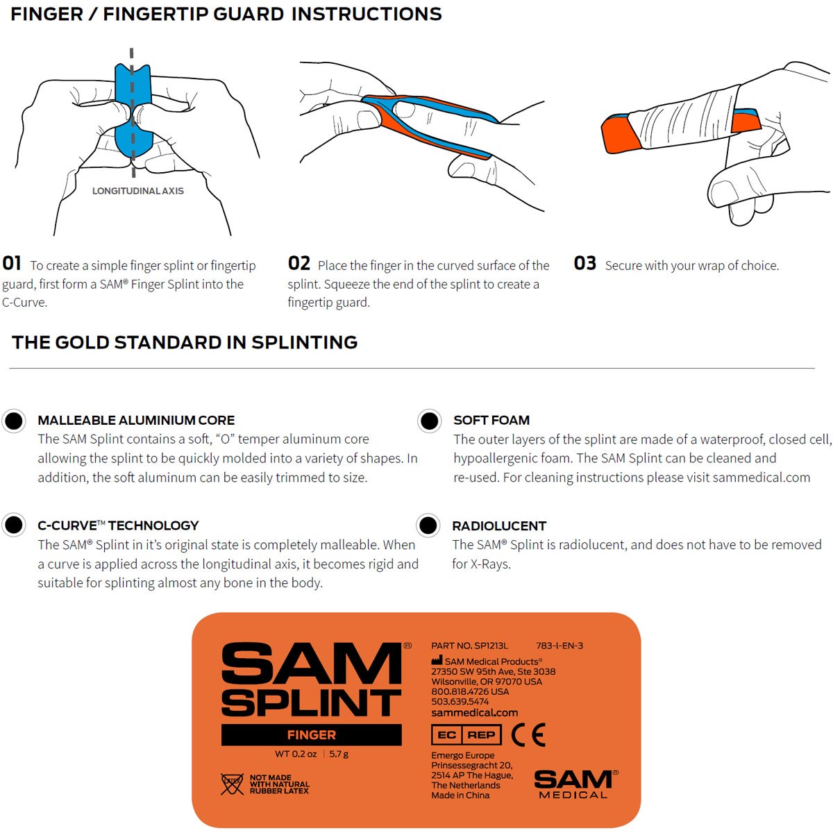 Acclaimed by emergency care providers and outdoor enthusiasts worldwide (and even beyond the Earth, on NASA space shuttles). The SAM® Splint is the gold standard in splints. Built from a thin core of aluminum alloy and sandwiched between two layers of closed-cell foam, the SAM Splint can be bent into any of three simple curves, becoming extremely strong and supportive for any fractured or injured limb. The SAM Splint is incredibly lightweight (only 4.0 oz.), and no other device offers so many variations for the treatment of orthopedic emergencies.