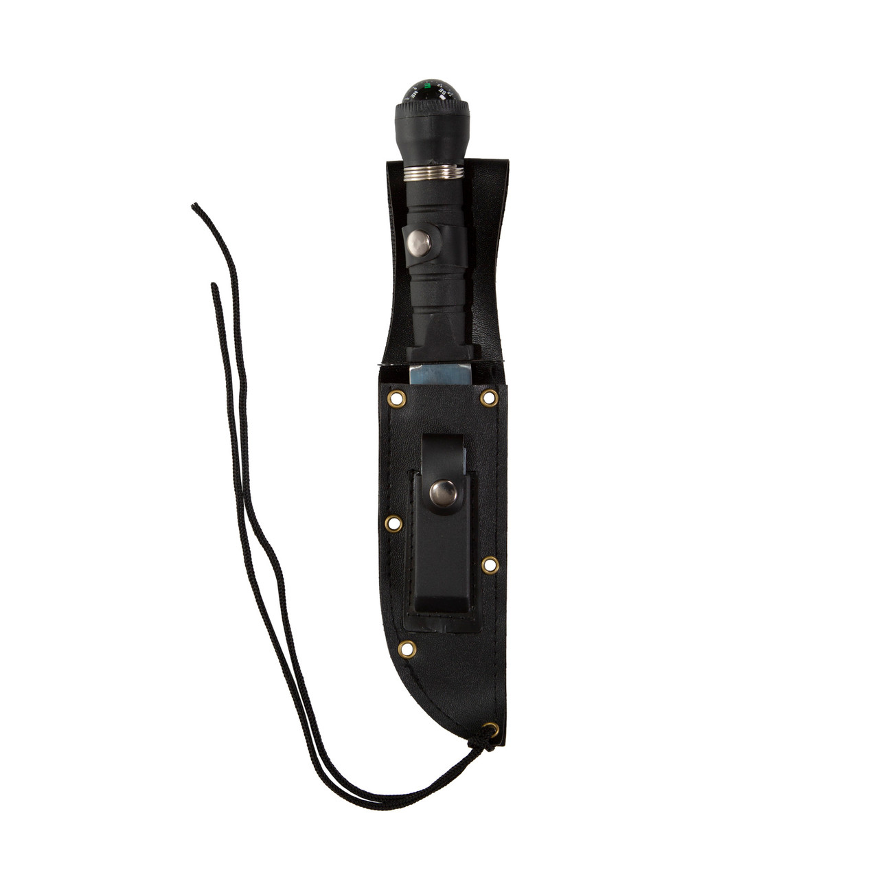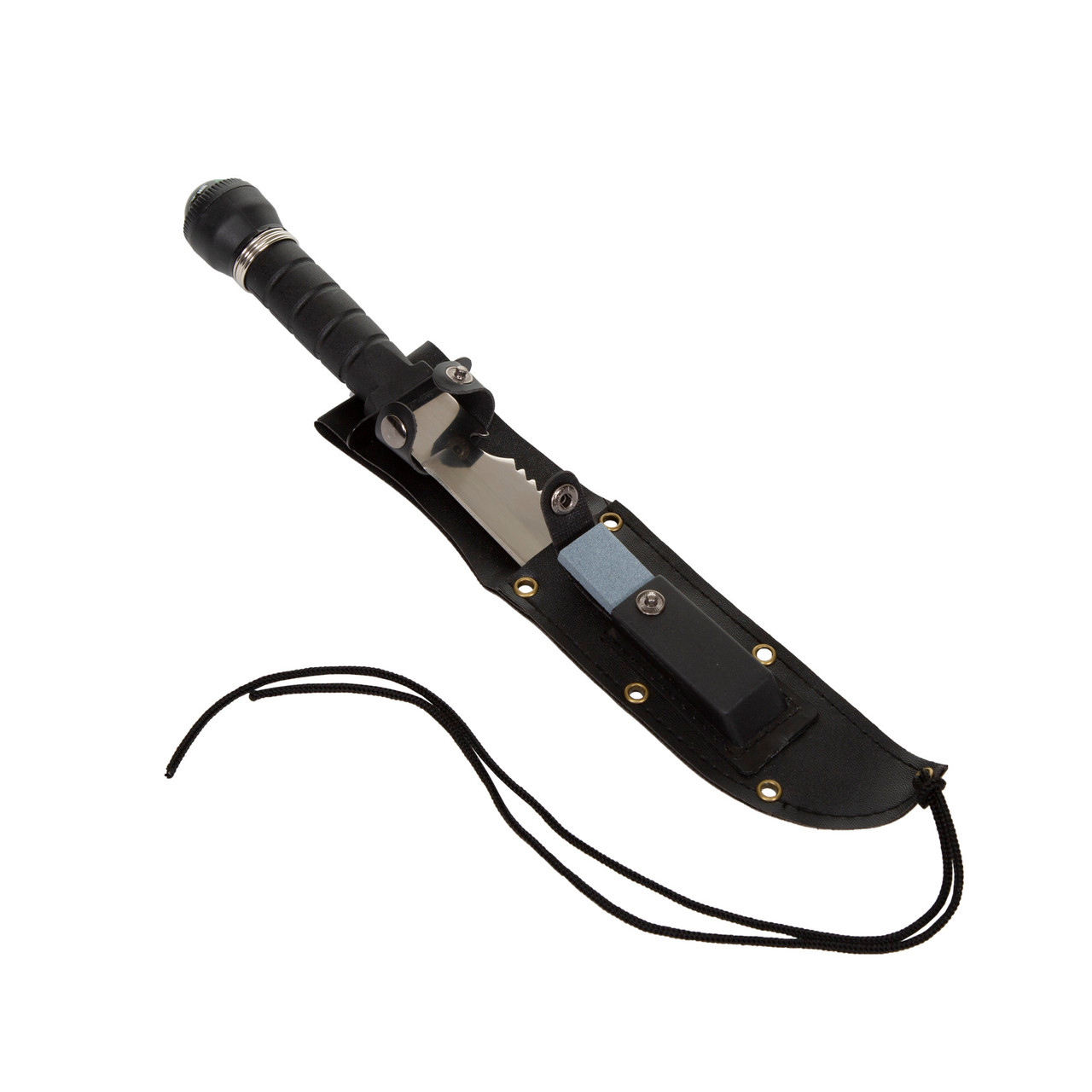 Six inch polished steel saw teeth blade. Bottle opener on back edge. Can be used as a signal mirror. High impact ABS hollow handle contains the following essentials: matches with striking pad, wire ring saw, fish hooks and leads, nylon line for fishing and needles. Watertight screw on cap with liquid filled compass. Sheath with sharpening stone. Belt loop and leg strap on sheath.