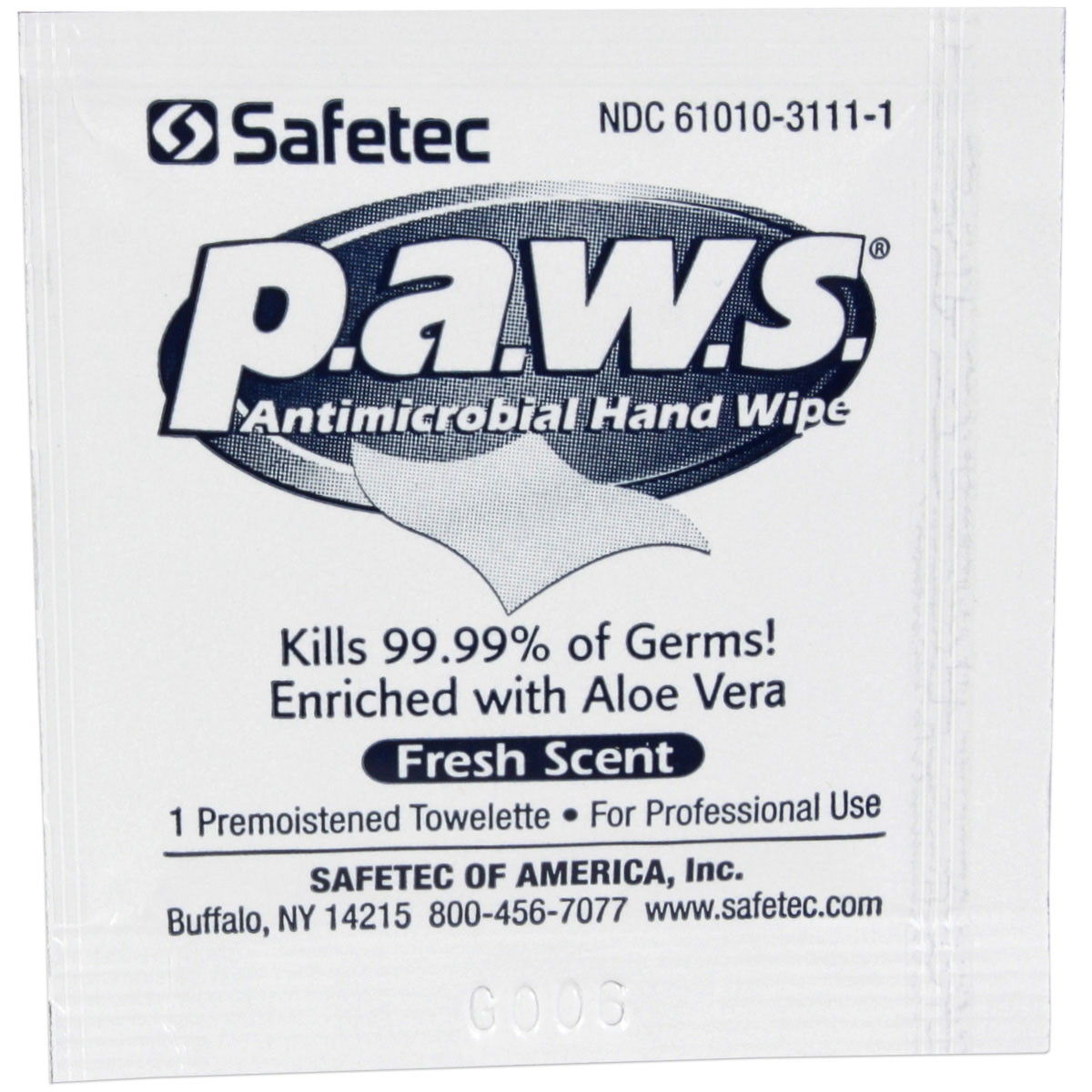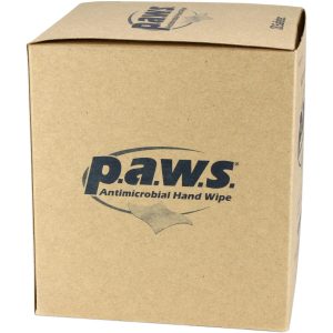 5″x8″ Personal Antimicrobial (kills germs) Wipe – 100 Per Boxp.a.w.s.® antimicrobial hand wipes are formulated with 66.5% ethyl-alcohol to help you meet CDC, APIC and OSHA hand washing recommendations and aloe vera to add moisture with each use. The individually wrapped p.a.w.s.® towelettes come in convenient mini pouches and pull out canisters. p.a.w.s.® wipes not only kill 99.99% of germs, but they also remove debris and soil from hands and under fingernails, an important function in the absence of soap and water. p.a.w.s.® has demonstrated virucidal activity against HIV and Avian Flu A in 15 seconds. (Results of in vitro time kill test studies)
